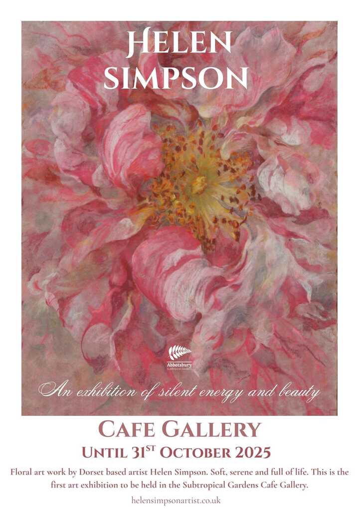 Floral art work by Dorset based artist Helen Simpson. Soft, serene and full of life. This is the first art exhibition to be held in the Subtropical Gardens Cafe Gallery.